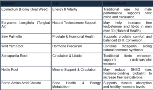 Circulation & Blood Flow: Saw Palmetto and Nettle Root support healthy prostate function and vascular tone, improving oxygen and nutrient delivery.